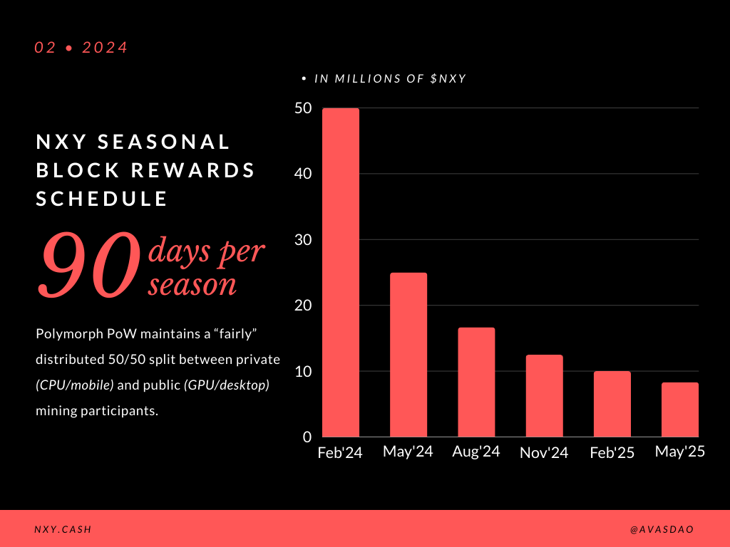 NXY has a simple rewards emission schedule that decreases the mining reward amount every 64,800 blocks (about 90 days).